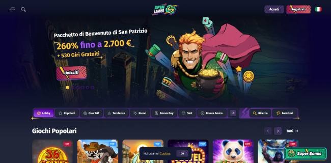 Spin Lander rappresenta la nuova generazione di casinò online non AAMS, con un’interfaccia moderna e funzionalità tecnologiche avanzate. Il suo pacchetto di benvenuto del 260% fino a 3.000€ + 530 giri gratis lo rende competitivo con i migliori del settore.